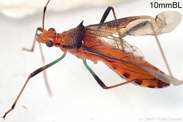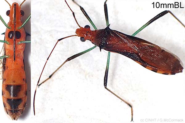 IdentificationElongate to 10mmBL. Red with black markings. HEAD red; Thorax posterior half black with two prominent spines; Hemilytra transparent with dark anterolaterally dark; Abdomen red with lateral black bars and ventral black patches; Hindthighs dark distally, slender, without spines.